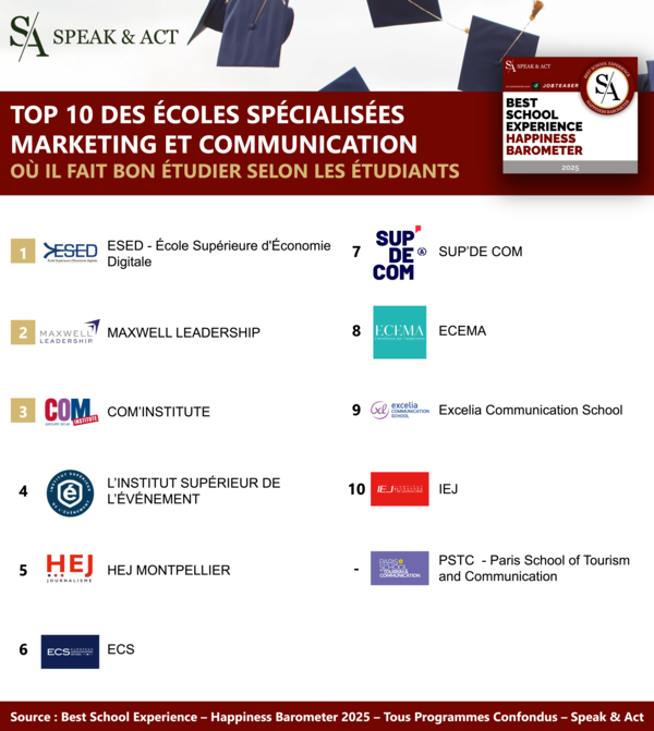 Le classement Best School Experience - Happiness Barometer de Speak & Act offre un regard unique sur les meilleures écoles de communication et marketing selon les avis des étudiants, en mettant en lumière celles qui valorisent le bien-être et la satisfaction étudiante. Que vous soyez étudiant en quête d'une formation ou parent accompagnant une décision, ce classement constitue un véritable guide pour découvrir les meilleures écoles selon l'expérience étudiante.