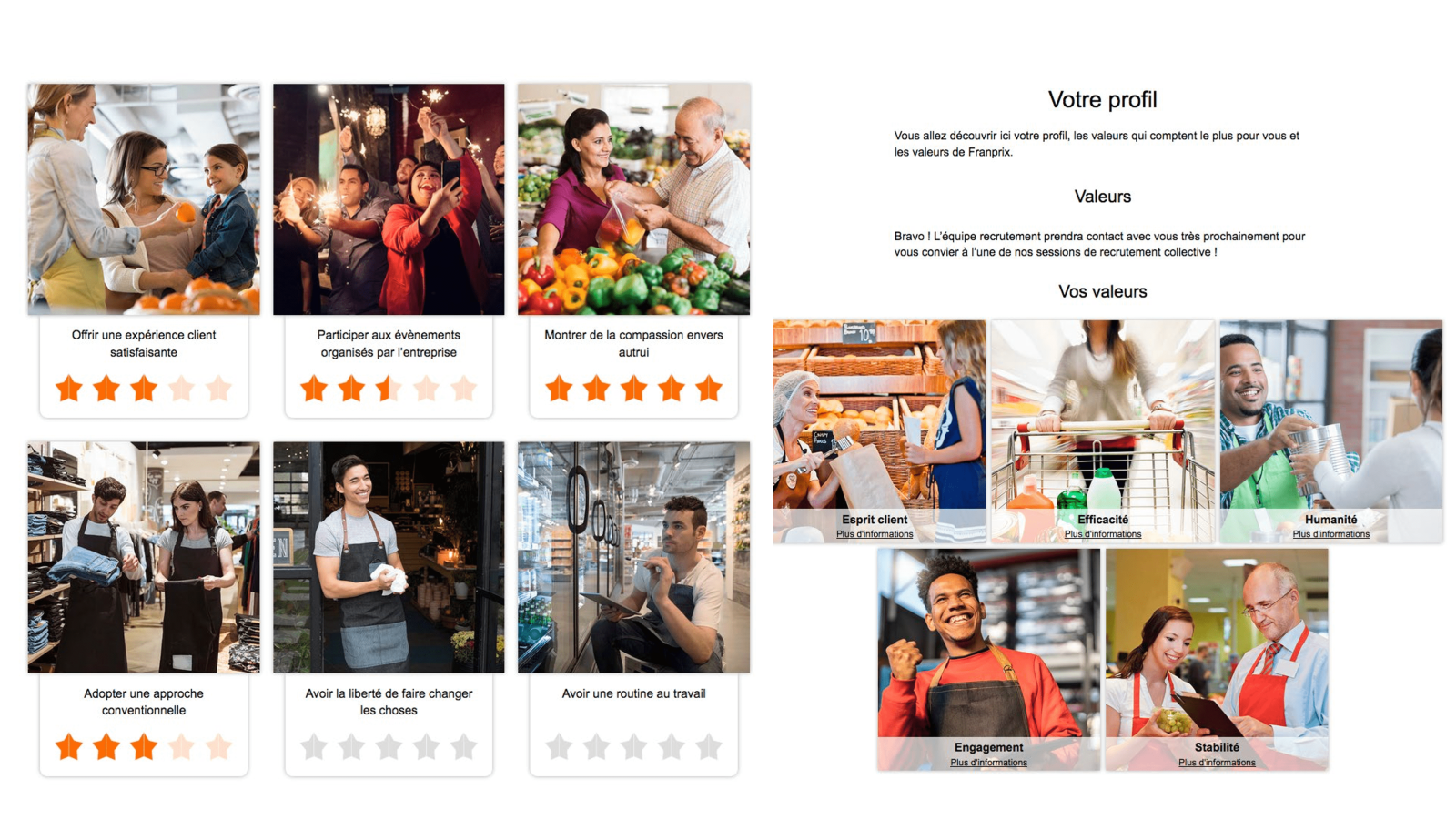 Lorsque le candidat postule à une offre via le canal qu'il souhaite, il reçoit un mail dans la foulée l'invitant à cliquer sur un lien pour jouer. Le candidat est invité à évaluer les 30 affirmations proposées (entre 1 à 5 étoiles) en fonction de son degré d'adéquation aux valeurs. Une fois toutes les affirmations évaluées, il obtient un retour personnalisé sur ses valeurs et celles de franprix. En fonction de son degré d'adéquation à l'enseigne, il reçoit, soit une convocation à une session de recrutement, soit un appel téléphonique, soit une réponse négative.