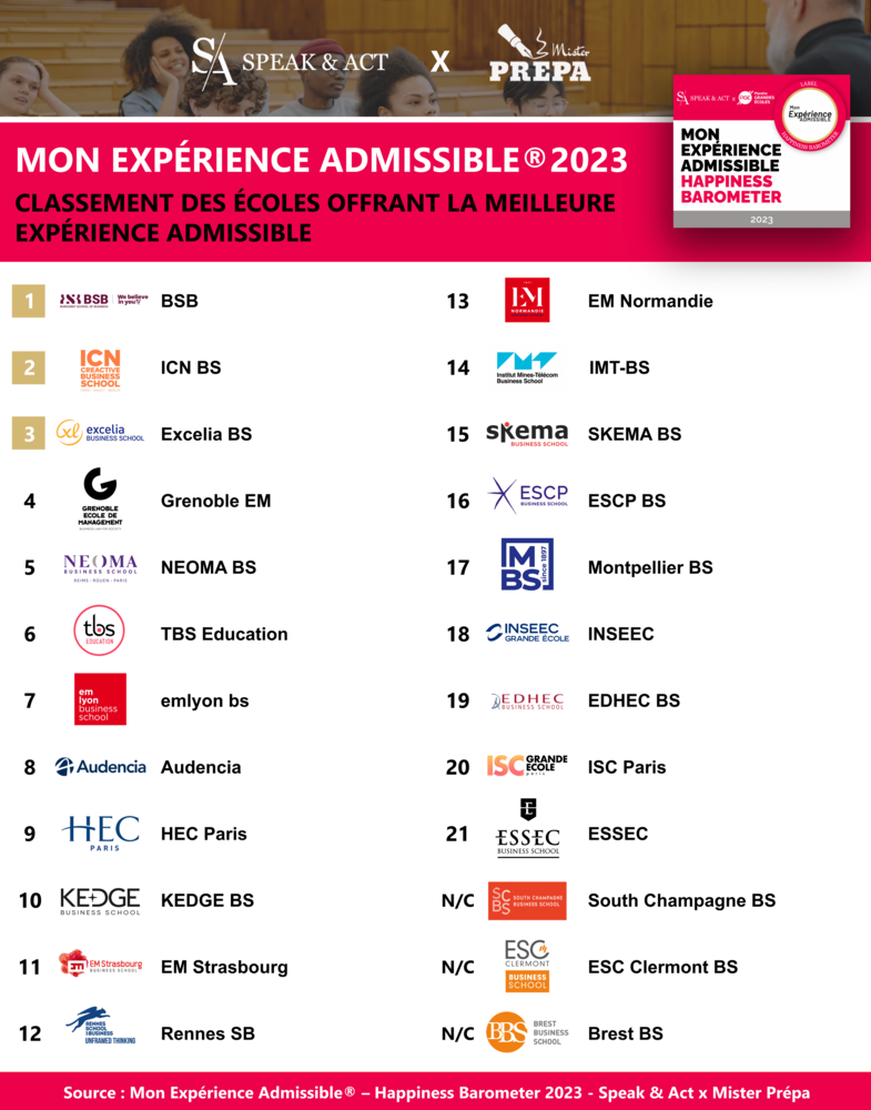 En collaboration avec Mister Prépa, Speak & Act a publié les résultats de l'enquête Mon Expérience Admissible® - Happiness Barometer 2023, qui classe les meilleurs examens oraux des écoles de commerce. Plus qu'un simple classement ou label école, il s'agit d'un outil au service des écoles et des étudiants afin d'évaluer l'expérience des candidats admissibles sur la base de leurs retours.