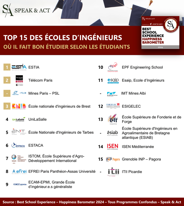 Aujourd'hui, découvrez la 6ème édition du classement Best School Experience - Happiness Barometer de Speak & Act, réalisé en collaboration avec JobTeaser, permet de déterminer les écoles d'ingénieurs offrant la meilleure expérience étudiante. Ce classement, basé sur les avis des étudiants, met en lumière les écoles d'ingénieurs où il fait bon étudier, offrant ainsi une ressource inestimable pour ceux qui sont en quête d'excellence académique et professionnelle.