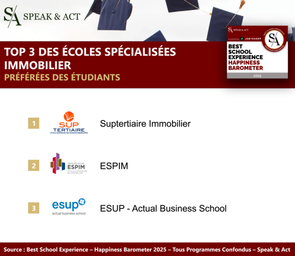 Découvrez les trois écoles d'immobilier qui se démarquent cette année selon le classement Best School Experience - Happiness Barometer 2025 :