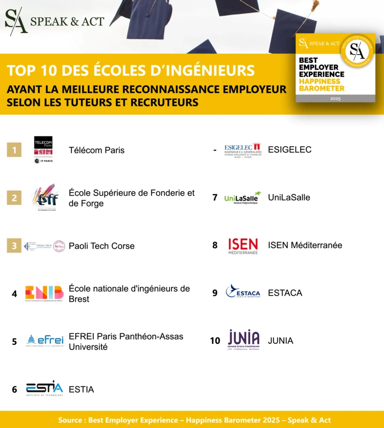 En 2025, les écoles d'ingénieurs les plus appréciées des recruteurs se distinguent par leur reconnaissance employeur (84 %), la qualité perçue de l'alternance et leur engagement RSE. C'est ce que révèle la dernière enquête Best Employer Experience - Happiness Barometer, publié par Speak & Act Institute. Basé sur les avis croisés de plus de 24 000 professionnels - tuteurs, recruteurs et employeurs - ce baromètre met en lumière les écoles d'ingénieurs qui entretiennent les relations les plus solides avec le monde de l'entreprise.