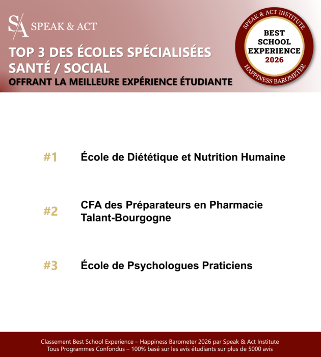 Et pour cause, Niels Tatem, fondateur de Speak & Act Institute, souligne le fait que "former un professionnel de santé ne consiste pas uniquement à transmettre des compétences techniques. Cela suppose de créer un environnement exigeant, protecteur et profondément humain. Le classement Best School Experience 2026 révèle les écoles de santé qui ont compris que la qualité des soins de demain commence par la qualité de l'expérience étudiante aujourd'hui."